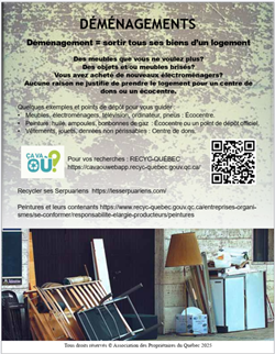 Year after year, we see tenants "forgetting" to leave and/or taking their furniture or belongings with them. Due to the lack of punitive consequences permitted by law, more and more tenants are treating the apartment they're leaving as an eco-centre. They no longer want to keep their furniture. It’s often broken, so why bother taking it out and taking it to a recycling centre? The Québec Landlords Association (APQ) has designed a poster with links to encourage tenants to remove ALL their belongings on moving day.